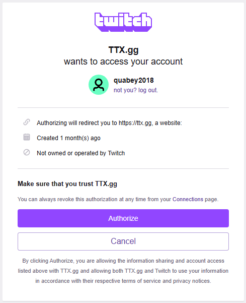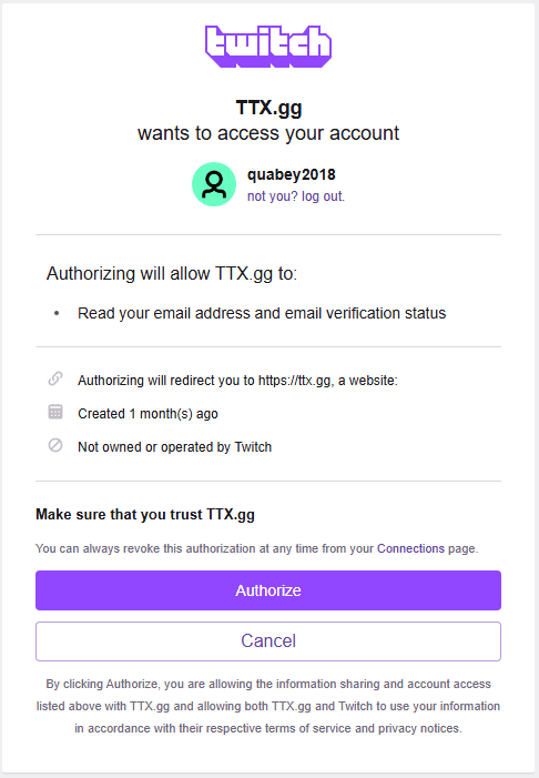 When navigating to the Twitch Login page, it lists out the permissions we request. If any data was requested it would show "Authorizing will Allow TTX.gg to." Since we do not request any information this section is hidden.